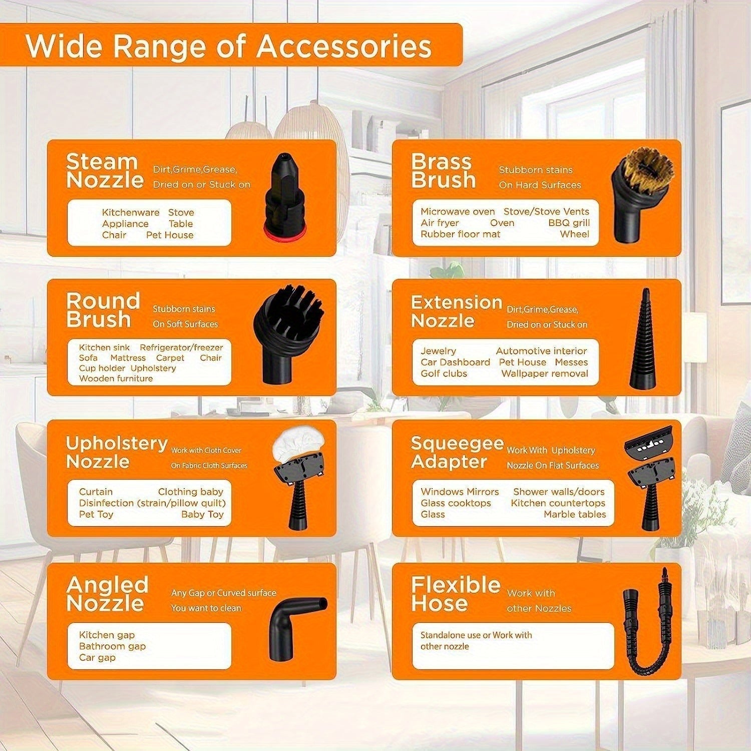 Multi-functional Steam Cleaner The handheld steam cleaner can heat up to 230 degrees Fahrenheit in approximately 3 - 4 minutes and clean stains, dust, oil and so on. Our 1050-watt household steam cleaner can clean a variety of surfaces, including ceramic tile floors, upholstery, bathtub grout and so on. Easy and Efficient There's no need for any complicated tools or too much effort - just pour in water and heat it up. Clean up the mess right away! Chemical-free and Safe Our handheld steam cleaner is 100% safe and free of chemicals - so you can clean without any worries. 11-piece Accessory Set Our steam cleaner comes with a 12-piece accessory set specifically - to meet all kinds of cleaning needs you may have! It's easy to attach and detach. Large Water Tank The 450-milliliter capacity water tank of the steam cleaner (the recommended load capacity is 380 milliliters) enables you to focus on cleaning instead of refilling water frequently. Even during a long cleaning process, the ergonomic handle can reduce the burden on your hands, making it more comfortable to use. Lightweight and Portable The compact body and handheld design of the steam cleaner make it very easy to carry around. Important Tips When adding water, please make sure that all the steam is completely released after use. Wait for 1 minute and then carefully open the lid. After that, unplug the steam cleaner when it's not in use. When you need to use it again, please carefully add water, tighten the lid, plug in the steam cleaner and then use it.